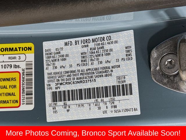 Don't miss your chance to experience the exceptional quality and capability of this 2022 Ford Bronco Sport Outer Banks Tech Pkg! Visit our showroom today and let us demonstrate why this vehicle is the perfect fit for your lifestyle.