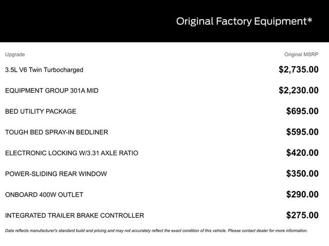 • 3.5L V6 Twin Turbocharged (EcoBoost) (Includes Auto Start-Stop Technology, 3.31 Axle Ratio and GVWR: 7,050 lbs Payload Package)