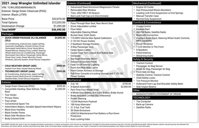 Explore the thrilling capabilities of the 2021 Jeep Wrangler Unlimited Islander, a rugged and versatile SUV that's ready to take you on any adventure. This stunning Green-colored Wrangler boasts an impressive array of features, including: