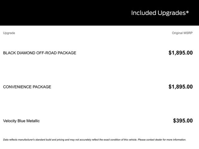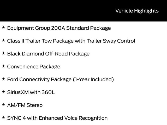 Recent Arrival! 400W Pro Power Onboard, AM/FM Stereo, Auxiliary Switches and Wiring, Black Diamond Off-Road Package, Class II Trailer Tow Package with Trailer Sway Control, Cloth with Easy-to-Clean Front Bucket Seats, Convenience Package, Equipment Group 200A Standard Package, Flood Light Adjustable Liftgate, Ford Connectivity Package (1-Year Included), Front Black Molded-in-Color (MIC) Bumper, Front Brush Guard, Front Driver/Passenger Seat Back Map Pockets, Heated 8-Way Power Driver's Seat, LED Fog Lamps, Premium Wrapped Steering Wheel, SiriusXM with 360L, SYNC 4 with Enhanced Voice Recognition, Wheels: 17" Carbonized Gray Painted Aluminum, Wheels: 17" Carbonized Gray-Painted Aluminum.