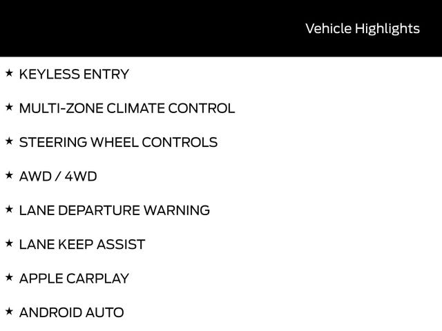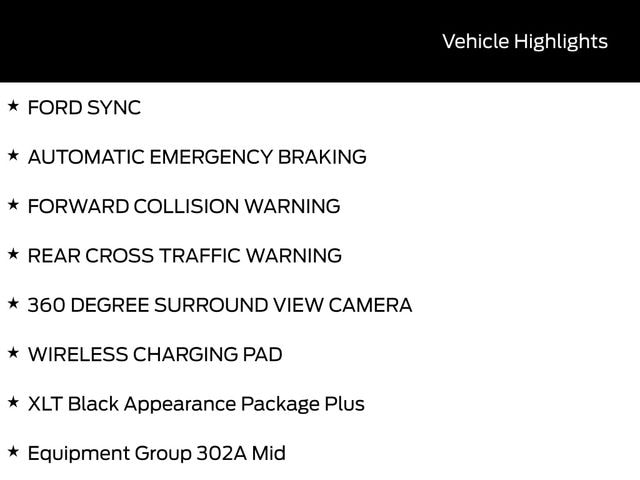 BACK UP CAMERA, BLUETOOTH, HEATED SEATS, TOW PACKAGE / TRAILER HITCH, REMOTE START, CRUISE CONTROL, POWER WINDOWS, POWER LOCKS, KEYLESS ENTRY, MULTI-ZONE CLIMATE CONTROL, STEERING WHEEL CONTROLS, AWD / 4WD, LANE DEPARTURE WARNING, LANE KEEP ASSIST, APPLE CARPLAY, ANDROID AUTO, FORD SYNC, AUTOMATIC EMERGENCY BRAKING, FORWARD COLLISION WARNING, REAR CROSS TRAFFIC WARNING, 360 DEGREE SURROUND VIEW CAMERA, WIRELESS CHARGING PAD, 4WD, 18" Painted Aluminum Wheels, 3.55 Axle Ratio, 360 Degree Camera, 400W Pro Power Onboard (cab & Bed), 6" Black Running Boards, Adaptive Cruise Control with Stop and Go, AEB Oncoming, Auto-Dimming Rear-View Mirror, Black Exterior Badging, Black Grille, Black Platform Running Boards, Body-Color Door Handles, Body-Color Front and Rear Bumpers, Cloth 40/20/40 Front Seat, Dark Interior Appliques, Dual Exhaust with Black Tips, Dual-Zone Electronic Automatic Temperature Control, Equipment Group 302A Mid, Floor Shifter, Ford Co-Pilot360 Assist 2.0, Ford Connectivity Package (1-Year Included), Front Parking Sensors, Gray Box Side Decal, GVWR: 6,650 lbs Payload Package, Heated Front Seats, Intelligent Access with Push Button Start, Internet access capable: 5G Modem - Ford Connectivity Package, Power Glass Heated Sideview Mirrors, Power-Sliding Rear Window, Radio: AM/FM Stereo with SiriusXM 360L, Remote Start System with Remote Tailgate Release, SYNC 4 with Enhanced Voice Recognition, Towing Technology, Wheels: 20" Gloss Black Painted Aluminum, Wrapped Steering Wheel, XLT Black Appearance Package Plus.