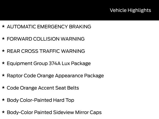 LEATHER SEATS, BACK UP CAMERA, BLUETOOTH, HEATED SEATS, REMOTE START, CRUISE CONTROL, POWER WINDOWS, POWER LOCKS, MULTI-ZONE CLIMATE CONTROL, STEERING WHEEL CONTROLS, AWD / 4WD, LANE DEPARTURE WARNING, LANE KEEP ASSIST, APPLE CARPLAY, ANDROID AUTO, FORD SYNC, AUTOMATIC EMERGENCY BRAKING, FORWARD COLLISION WARNING, REAR CROSS TRAFFIC WARNING, Body Color-Painted Hard Top, Body-Color Painted Sideview Mirror Caps, Code Orange Accent Seat Belts, Equipment Group 374A Lux Package, Hard Top Sound Deadening Headliner, Interior Carbon Fiber Pack, Raptor Code Orange Appearance Package, Rear-Window Defroster & Washer, Wheels: 17" Dark Carbonized Gray Alloy Painted.