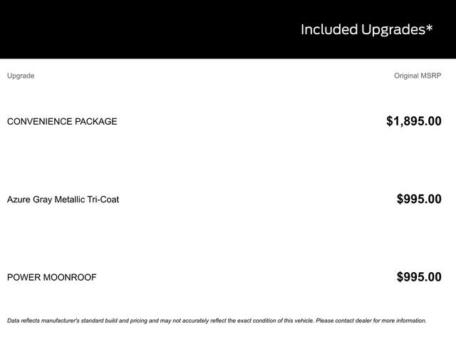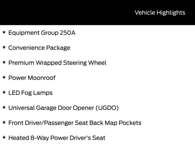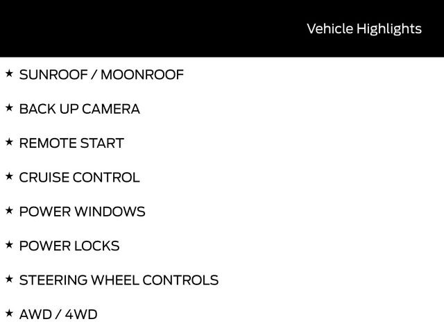 SUNROOF / MOONROOF, BACK UP CAMERA, REMOTE START, CRUISE CONTROL, POWER WINDOWS, POWER LOCKS, STEERING WHEEL CONTROLS, AWD / 4WD, LANE DEPARTURE WARNING, LANE KEEP ASSIST, APPLE CARPLAY, ANDROID AUTO, FORD SYNC, AUTOMATIC EMERGENCY BRAKING, FORWARD COLLISION WARNING, REAR CROSS TRAFFIC WARNING, Convenience Package, Equipment Group 250A, Front Driver/Passenger Seat Back Map Pockets, Heated 8-Way Power Driver's Seat, LED Fog Lamps, Power Moonroof, Premium Wrapped Steering Wheel, Universal Garage Door Opener (UGDO). 25/30 City/Highway MPG