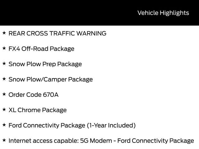 BACK UP CAMERA, BLUETOOTH, TOW PACKAGE / TRAILER HITCH, REMOTE START, CRUISE CONTROL, POWER WINDOWS, POWER LOCKS, STEERING WHEEL CONTROLS, AWD / 4WD, LANE DEPARTURE WARNING, LANE KEEP ASSIST, APPLE CARPLAY, ANDROID AUTO, FORD SYNC, AUTOMATIC EMERGENCY BRAKING, FORWARD COLLISION WARNING, REAR CROSS TRAFFIC WARNING, 4WD, 250 Amp Alternator, 410 Amp Dual Alternators, Chrome Front Bumper, Chrome Rear Step Bumper, Ford Connectivity Package (1-Year Included), FX4 Off-Road Package, Halogen Fog Lamps, Hill Descent Control, Internet access capable: 5G Modem - Ford Connectivity Package, Off-Road Specifically Tuned Shock Absorbers, Order Code 670A, Rapid-Heat Supplemental Cab Heater, Snow Plow Prep Package, Snow Plow/Camper Package, Unique FX4 Off-Road Box Decal, XL Chrome Package.