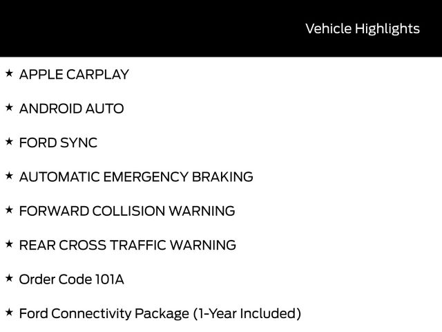 BACK UP CAMERA, BLUETOOTH, CRUISE CONTROL, POWER WINDOWS, POWER LOCKS, STEERING WHEEL CONTROLS, LANE DEPARTURE WARNING, LANE KEEP ASSIST, APPLE CARPLAY, ANDROID AUTO, FORD SYNC, AUTOMATIC EMERGENCY BRAKING, FORWARD COLLISION WARNING, REAR CROSS TRAFFIC WARNING, Ford Connectivity Package (1-Year Included), Order Code 101A. Priced below KBB Fair Purchase Price!